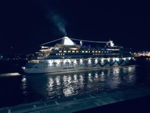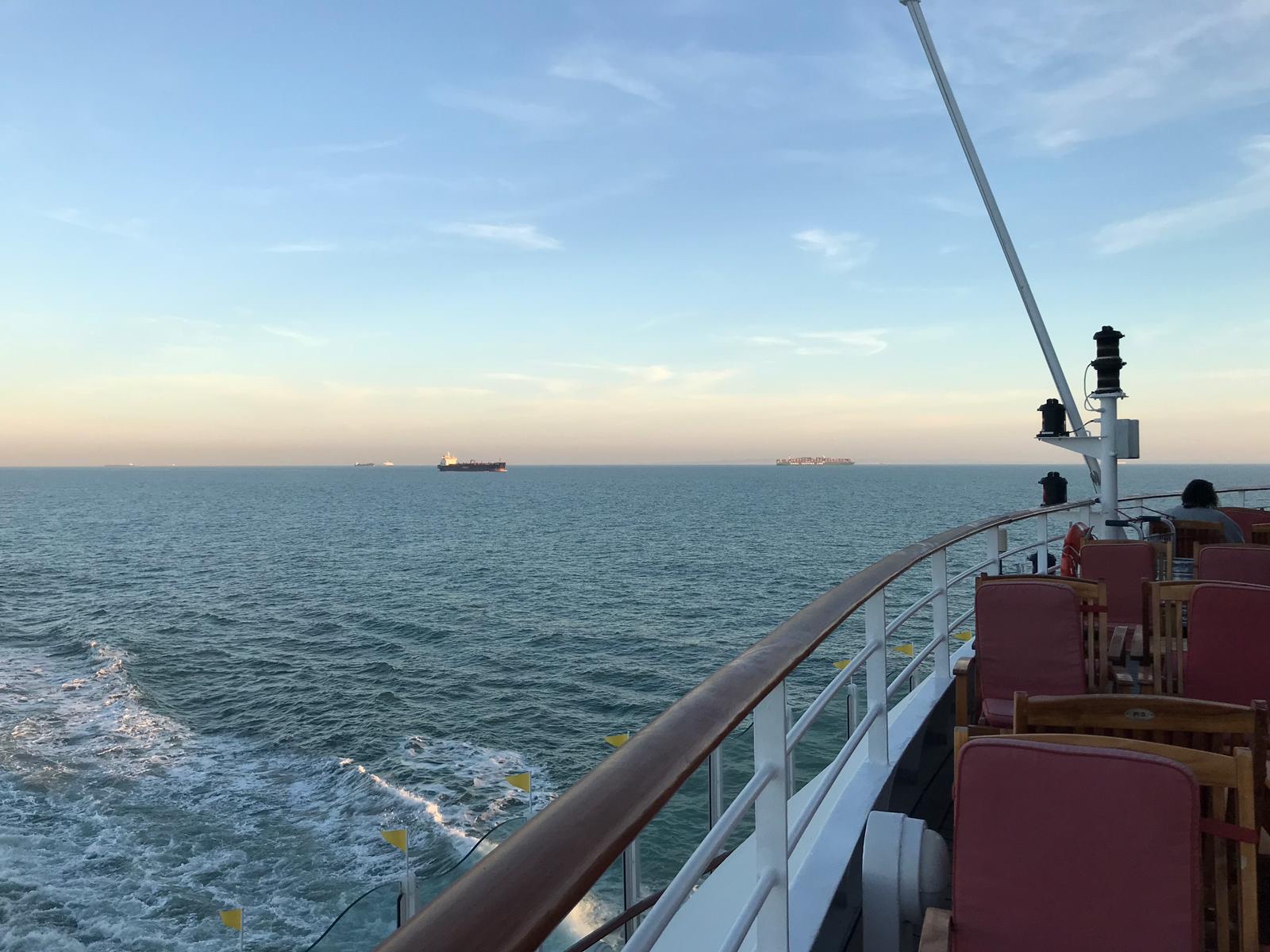 Eben habe ich in der tollen „Mucki-Bude“ mal einen Heimtrainer ausprobiert. Muss etwas f Kondition u operiertes Knie tun. Anschließend noch mit Stöcken 2 Runden über das Schiff. Das gefällt mir so richtig gut an der frischen Atlantikluft.