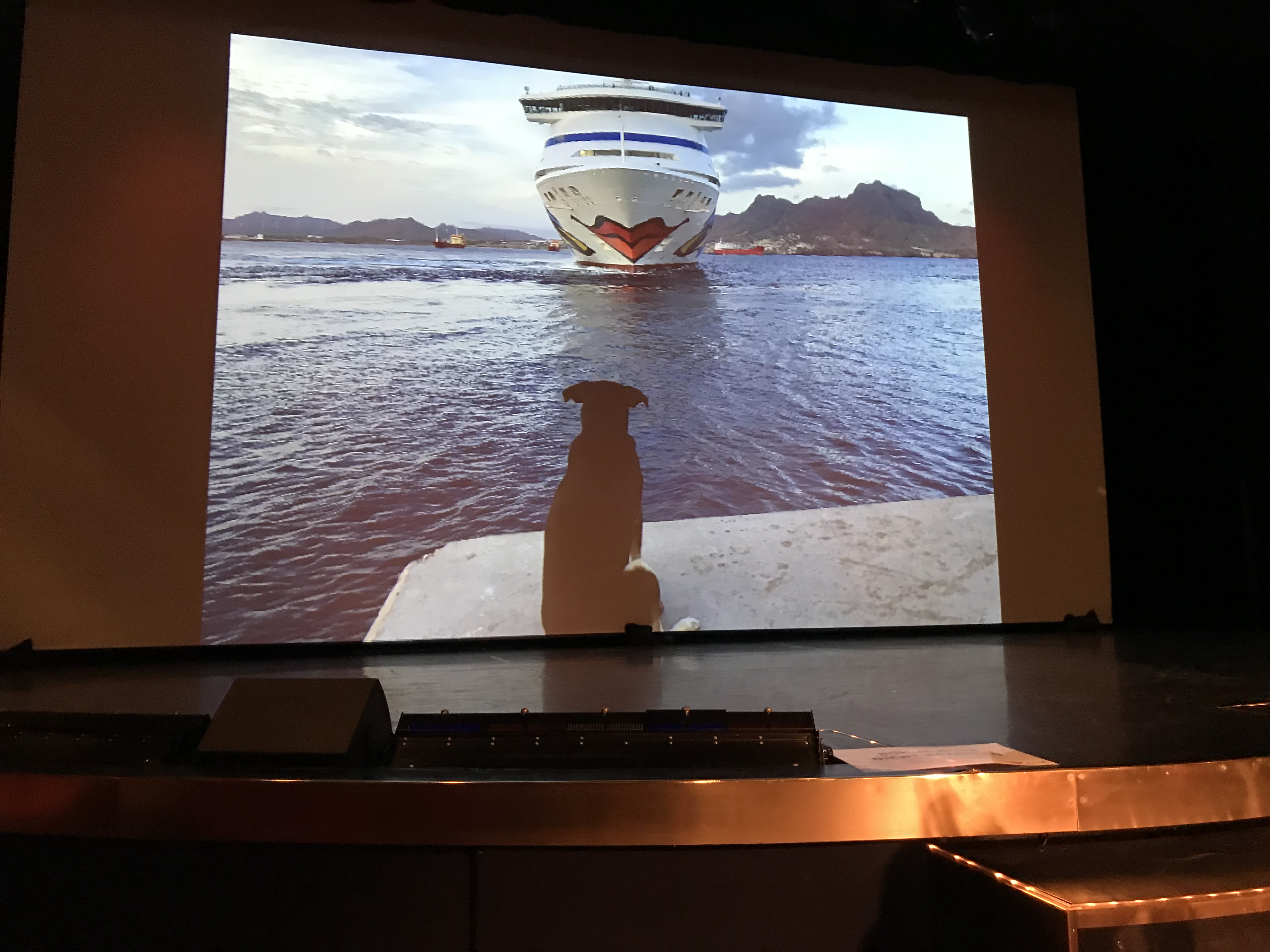 Der schwarze Hund, welcher seit Tagen auf dem Pier liegt u alle Hafenarbeiter verbellen möchte, schaut traurig hinter uns her.